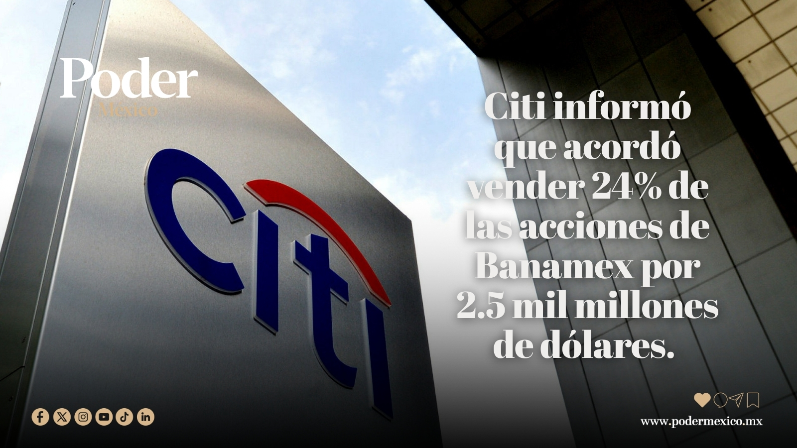 Citi informó este lunes que acordó vender 24% de las acciones de Banamex, cifra proporcional a 43 mil millones de pesos o 2.5 mil millones de dólares. Dicho porcentaje fue adquirido por inversionistas institucionales como General Atlantic, Afore SURA, Banco BTG Pactual, Chubb, fondos gestionados por Blackstone, Liberty Strategic Capital, y Qatar Investment Authority (QIA). De acuerdo con Citi, Fernando …